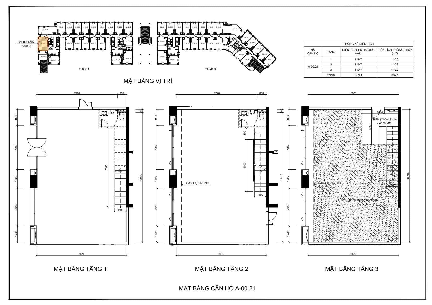 • Tổng diện tích sàn sử dụng: ~750m² (mỗi căn 17 x 12,5m, kết cấu 3 tầng)